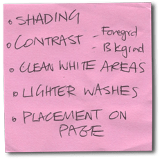 Before I set off I wrote up a little post-it note of my five key elements and kept it on my drawing board as a constant reminder while I was drawing (see left image).