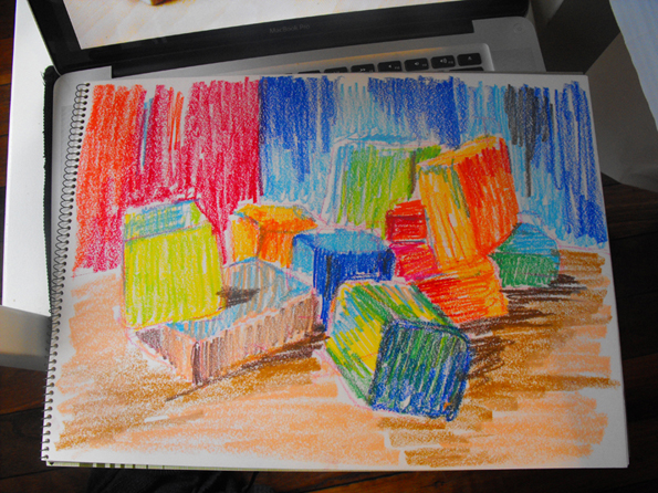 My next one was from photos I took of some old building blocks. Initially I wanted to play around with the strong lighting and shapes. So I used another water soluble medium, and wanted to spread the colour with my old Letraset markers I used to use for storyboarding. But they were sooooo dry I couldn’t barely colour in one side of a block. Thus, I lost track of what I wanted to accomplish in my attempt to get some ink out of these pens. I will say this, they didnt get re-packed for the trip home!